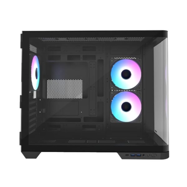 Featuring the innovative Back-Connect Design, this chassis optimizes cable management, enhances airflow, and elevates the overall system aesthetics. The clutter-free design not only simplifies assembly but also ensures efficient cooling performance for high-end hardware. Equipped with three pre-installed 120mm ARGB fans—two on the side and one at the rear—it delivers vibrant lighting effects that can be customized via the LED light switch or your ARGB-compatible motherboard. Additionally, the side-mounted reverse-blade fans significantly boost air intake, ensuring optimal airflow and enhanced cooling efficiency.
